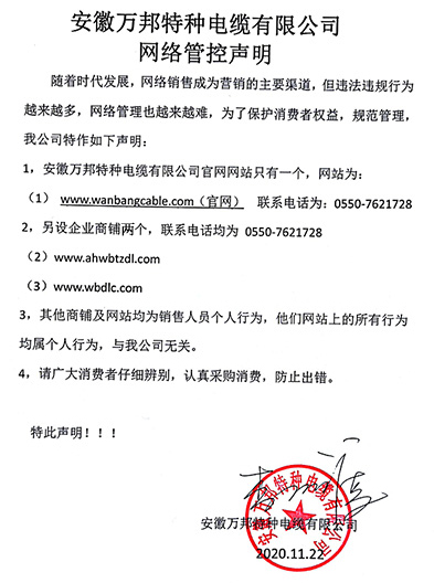鄭重聲明:安徽萬邦特種電纜有限公司官方網站為:www_wanbangcable_com.doudousc.com,除此之外無任何子網站或合作網站,其余均為假冒偽劣。電話:0550-7621728 13485756353 地 址:安徽省天長市滁州高新技術產業開發區經四路29號
